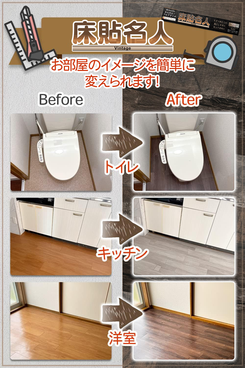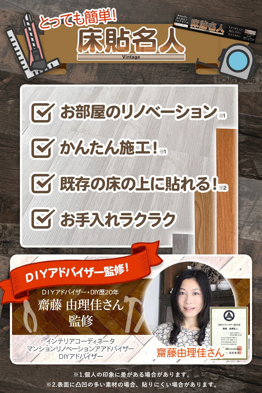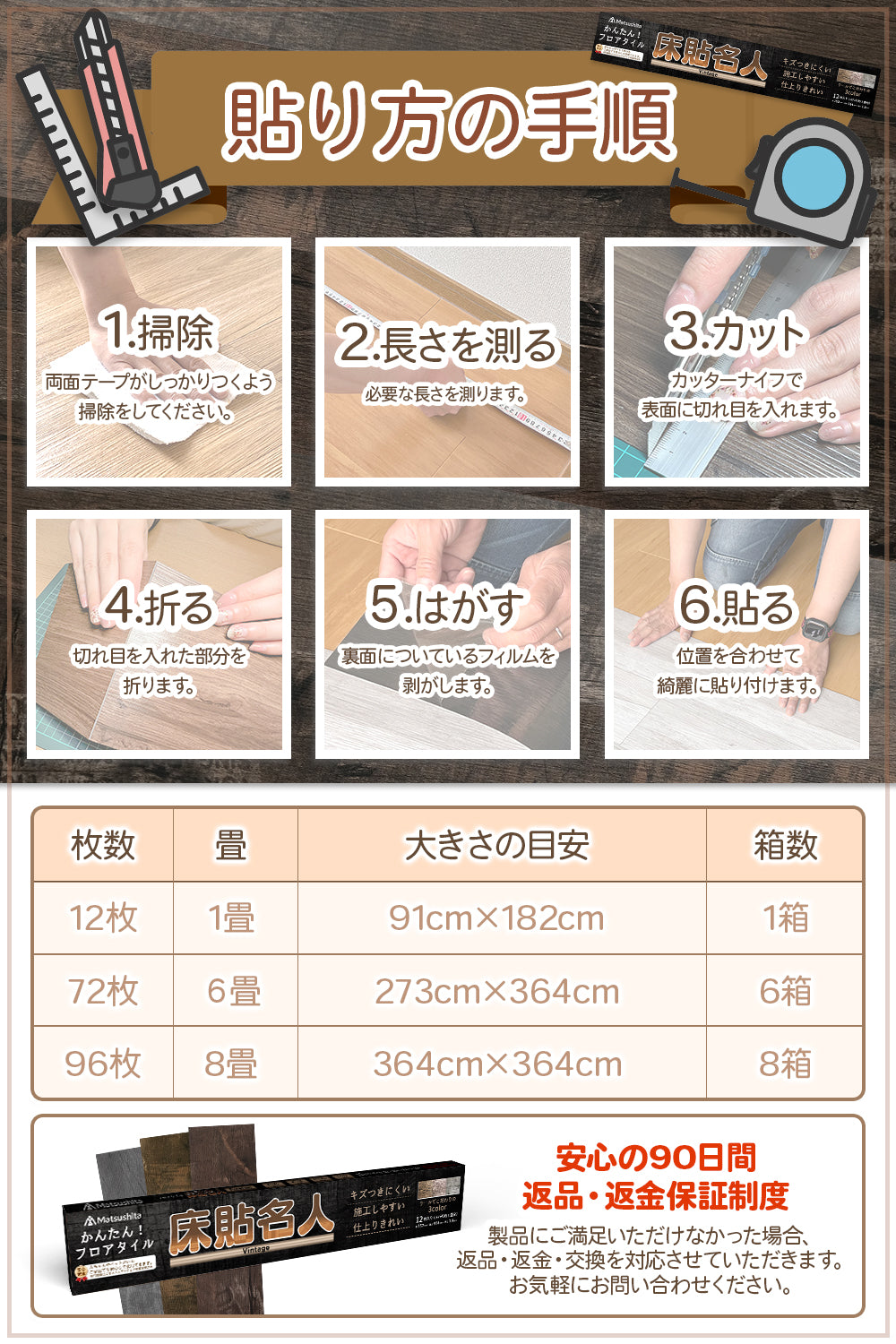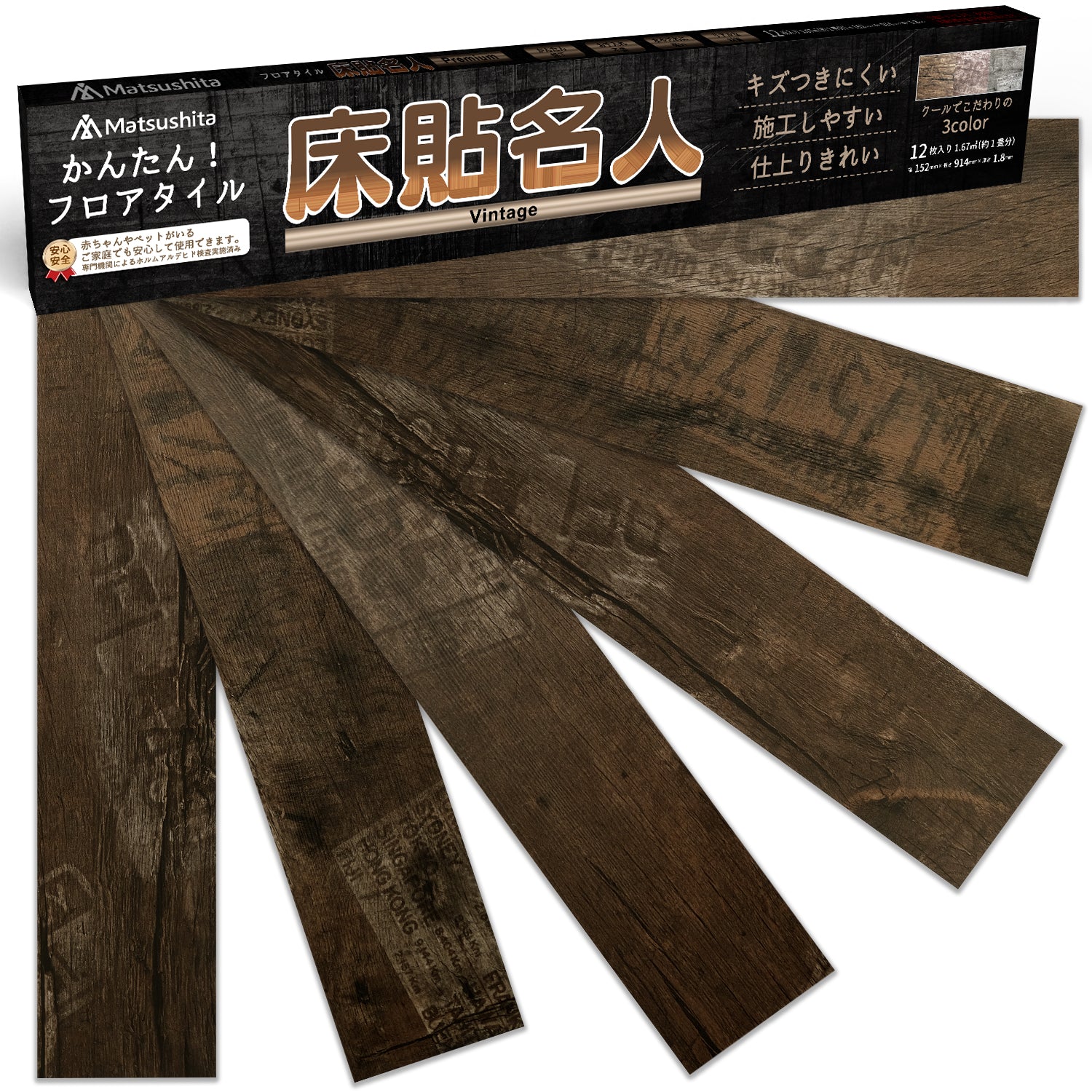 床貼名人V【DIYのプロが監修】フロアタイル かんたん施工 貼るだけ 接着剤不要 フローリング ペット対応 リノベーション DIY 日曜大工 ヴィンテージカラー 木目