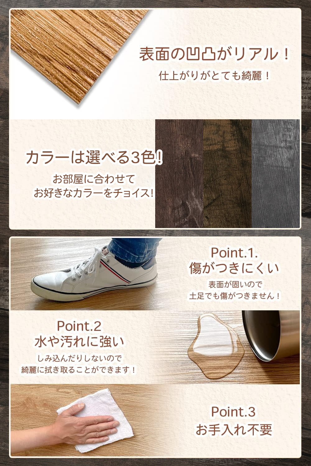 商品仕様: 1枚あたり:長さ 914mm|横幅 152mm|厚み 約1.8mm 【誰でも簡単DI Y】 ・裏面のシートをはがして貼るだけのかんたん施工 ・長さや幅はカッターやハサミでカットでき、初心者でも簡単にDIYできるフローリングシートです。 ・施工動画を参考にしてみてください。 ・張り間違えても、ゆっくり剥がし再度貼り直すことが可能です。(頻回に剥がすと粘着性が低下するので注意が必要です。) 【性能】 ご自宅のお部屋をオシャレにしたいけど、今の床の色味が気に入らないなどのお悩みのお客様にぴったり フローリングシートです。【優れた耐久性】 ・椅子やテーブルを移動する時にも 傷が付きにくく、土足でも丈夫なフロアタイルです。 ・防水加工で汚れに強く、表面についた汚れは掃除機や濡れ雑巾などで簡単に拭き取れます! ・ワックス等の特別なお手入れは不要!【ペットやお子様がいる環境でも安心】 ・専門機関によるホルムアルデヒド&アスベスト検証済みなので安心して使用いただけます。 ・置くだけのマットと違って床に貼り付けるので、シートがズレることがありません。 【注意事項】 ・畳や絨毯のようにやわらかい場所や凹凸のある場所ではご使用できません。 ・床暖房のお部屋にもご利用可能です。 ・裏面は粘着のため、賃貸物件など現状回復が必要の箇所には施工しないでください。 ・特殊な環境化(強い西日が当たるなど温度差の激しい部屋など)ではタイルが伸縮する場合があります。 ・気温が低い場合は、接着力が弱くなりますので部屋を温め、ドライヤー等で商品を暖めてから作業してください。 ・生産ロットが違う場合、柄/色味が若干変わってくる場合がございます。 ・商品の画像の色合いは、モニターの閲覧環境や設置環境により、色合いが異なって見える場合があります。大量購入の場合はサンプル購入していただき、ご覧いただいてからのご注文をお薦めします。 ・仕様、デザインは改良のため予告なく変更することがあります。